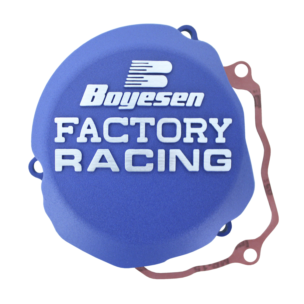 IN MOTOCROSS, FACTORY RACING MEANS PERFORMANCE. Set your bike apart from the rest with the ultimate look in race performance. Over the years, top US riders like Damon Bradshaw, Jeff Emig, Doug Dubach and Mike LaRocco, and many European greats including Stefan Everts have all helped to make the Factory Racing brand of ignition covers a recognizable part of motocross history that still lives on today. Add style and the Factory look to your bike with a Boyesen Factory Ignition Cover. Exterior grade, UV resistant powder coat finish is available in three classic colors. Made from investment cast aluminum, the Factory Cover is strong, lightweight, and durable providing years of outstanding protection. THE BOYESEN ADVANTAGE » Gives your bike the Factory Works look. » Lightweight factory ignition covers provide years of outstanding protection; guaranteed not to warp. » Cast from the highest quality aluminum. » Super-tough, powder-coated finish resists weathering and wear and tear. » Seals perfectly to keep out dirt and moisture. » Covers come with the gaskets. » Asbestos-free gasket is bound with nitrile for a tight, leak-free seal.