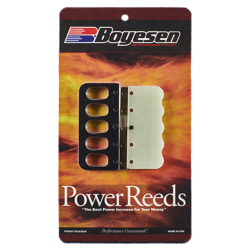 One reed petal is NOT enough! The reed petals in all 2 stroke engines take an incredible amount of abuse! At peak RPM, reed petals are opening and closing hundreds of times per second. Over time, a single reed loses its ability to regulate flow rates in proper proportions. This causes a loss of reed petal reaction and reduces the consistency of peak horsepower. Boyesen's revolutionary dual-stage reed design delivers more usable power than stock. Stock single-stage reeds operate most effectively within a relatively narrow RPM range and are limited because of the single stage design. Boyesen's one soft reed on top of one firm flow-through reed gives you a wide range of intake control, plus increased intake velocity. Your original reeds can't possibly duplicate that performance. The dual-stage design allows you to replace your stock reed stop with a Rev-Plate which permits the reeds to open freely and function efficiently. The multi-port feature of the bottom reed creates more channels for the charge, delivering increased velocity to the intake ports and generating more overall power. Dual-stage reeds work in unison to perform efficiently throughout the entire powerband. The difference in stiffness between the top reed and the bottom reed allow the reeds to respond quickly and accurately to changes in engine pressure. This translates into quicker acceleration, crisper throttle response and increased horsepower throughout the powerband.